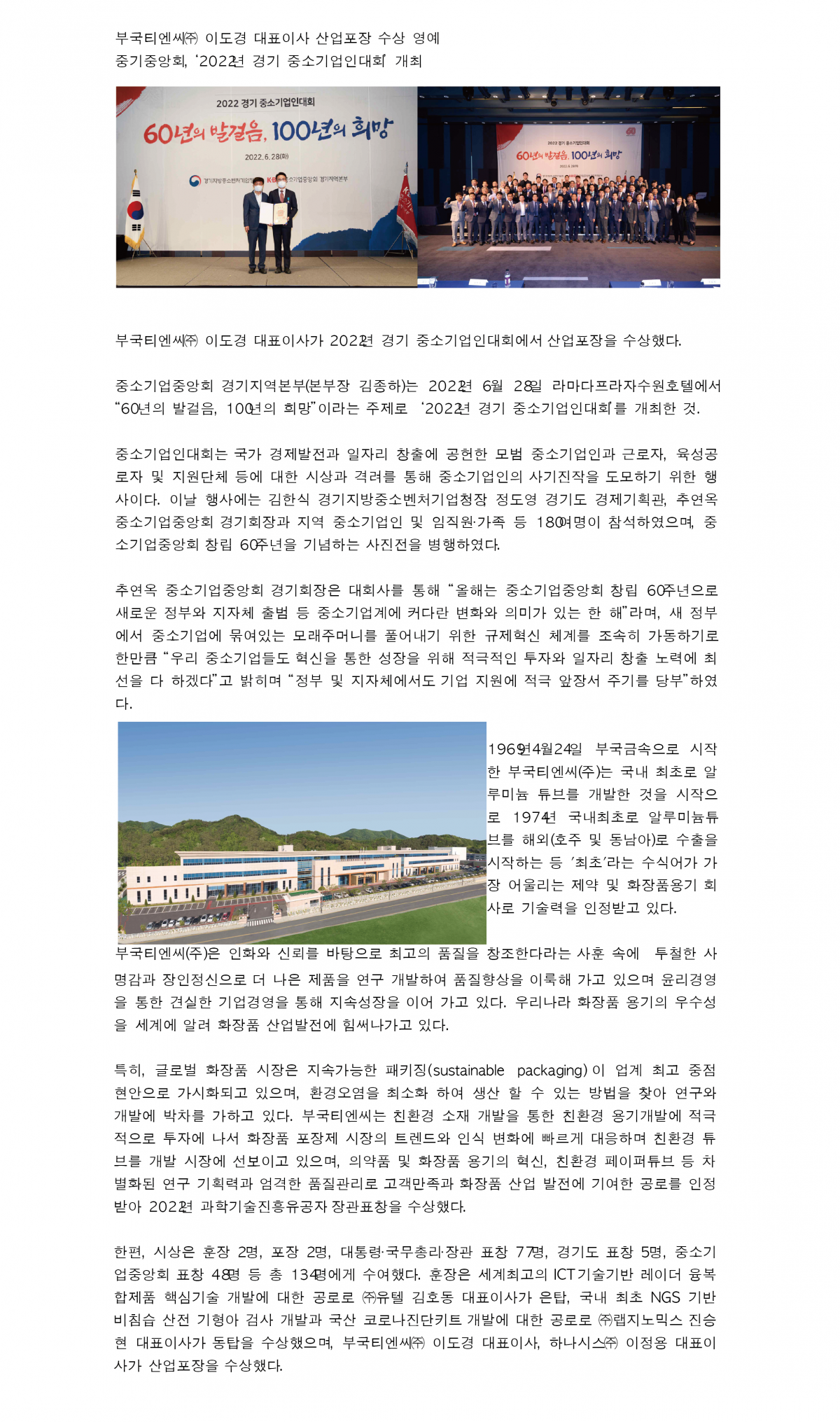 [기사] 부국티엔씨㈜ 이도경 대표이사 산업포장 수상 영예 페이지 정보 작성자 부국티엔씨주식회사 조회 1,154회 작성일 23-02-21 15:59 본문 . 목록 이전글 [기사] 부국티엔씨, 에코바디스 ESG _실버 등급_ 획득 다음글 [기사] 이도경 대표이사 2022년 과학기술진흥유공자 장관표창 수상